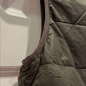 Stylish deep green puffer vest with button closure. Perfect for layering.