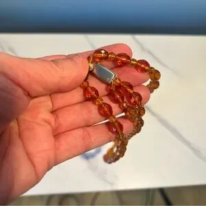This stunning amber glass beaded necklace adds a touch of elegance to any outfit. The rich amber color is perfect for both casual and formal occasions. Art deco. Slide silver closure with rhinestones