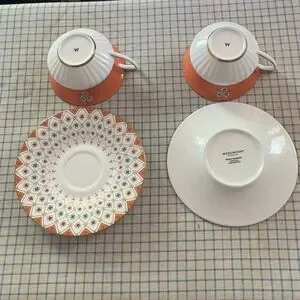 Dimensions: saucers are 6 inches in diameter. Cups are 4 inches in diameter at the top.