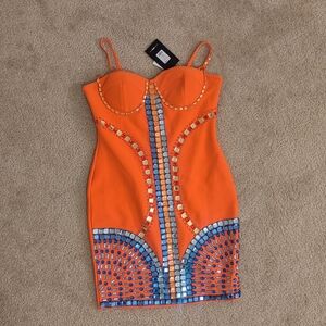 Make a statement with the Taylah orange bandage mini by Fashion Nova, adorned with eye-catching jewels. Perfect for turning heads at any event.