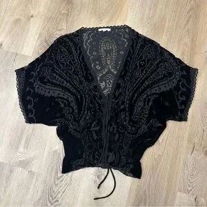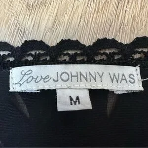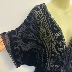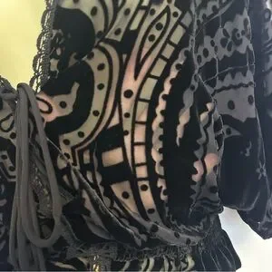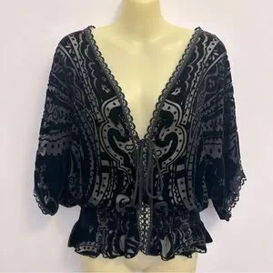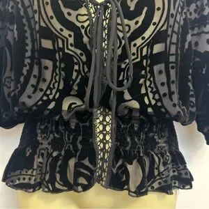 Johnny Was Black Velvet Semi Sheer Blouse with Embroidered Detailing