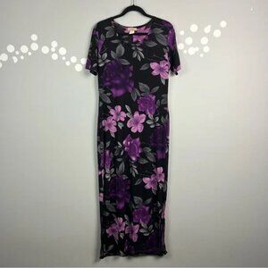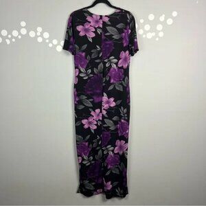 Step into timeless charm with this Susan Lawrence floral maxi dress in a beautiful purple, gray, and black palette. Featuring short sleeves, soft stretch fabric, and side slits for ease of movement, this semi-sheer knit dress is a versatile pick for casual days or lounging in style.