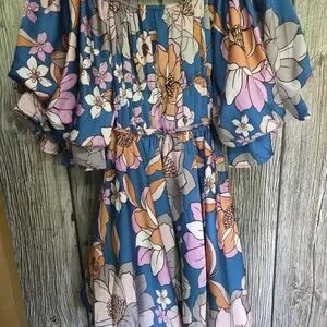Embrace elegance with this stunning bright floral off-shoulder dress. Featuring a beautiful blend of blue and pink hues, it's perfect for any occasion. Love this dress paired with sneakers for a casual look or heels for cocktail dress.