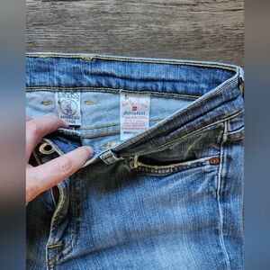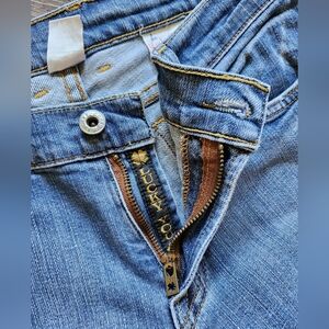 Lucky Brand Y2k Dungarees Sundown Denim Jeans, good pre worn condition, slight wear to bottom hems - see photos, size 10/30, waist 15 inches across front flat lay, rise 8.5 inches, length 40 inches, inseam 30.5 inches, 5 pocket design, see photos for materials, made in America, medium wash, faded, bootcut, y2k, denim