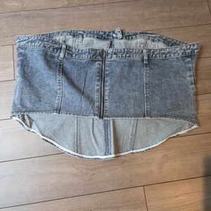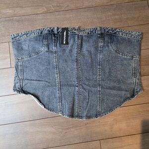 Stylish denim corset top. Features front pockets and button details. Perfect for casual wear.