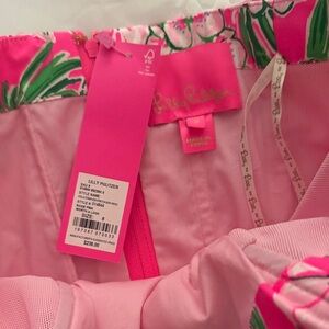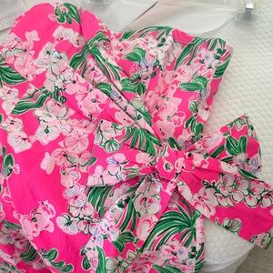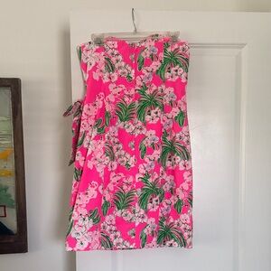 Chic strapless dress with vibrant floral design. Features elegant pink and green hues.