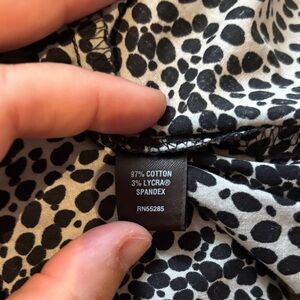 Wrap dress with a bold black and white dot pattern. Flattering V-neck and short sleeves. Perfect for stylish outings.