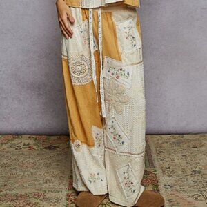 POL pants, boho patchwork pants, embroidered lounge pants, cotton wide leg pants, vintage lace pants, crochet detail pants, floral applique pants, relaxed fit boho pants, artisanal cotton pants, comfy boho chic, festival style, handmade look trousers, cottagecore fashion, elastic waist pants, soft cotton loungewear