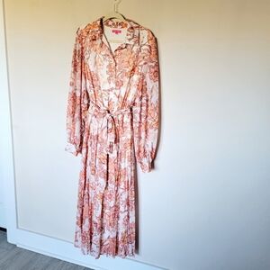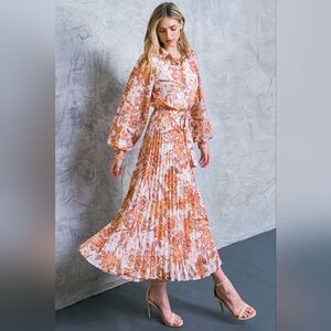 Look effortlessly polished in this Social Sensation Woven Midi Dress. This stylish piece features a shirt collar, button down, long sleeve with cuff, and an elasticized waist with self sash tie for a flattering fit. It's finished with a pleated skirt for feminine flair. Enjoy the perfect look for any occasion.