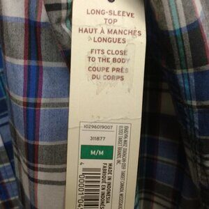 Offering a medium long-sleeved plaid shirt with the original tags still attached. It is 100% cotton, and has a front button closure. It was manufactured in April 2013.