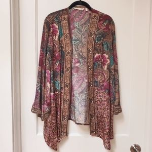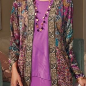 NWOT SOFT SURROUNDINGS Floral Print with Beaded Trim Topper; Never worn; Open Front; Beaded Design Trim and at Sleeve Cuff; Size =L; Pit-to-Pit = ; Shoulder-to-Hem = 30- 32".