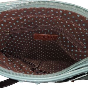 The interior is dark brown with teal polka dots. It includes a larger zip pocket and 2 credit card pockets.