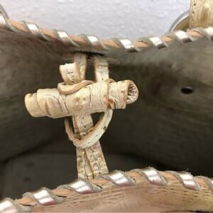 Dark ivory/ tan coloured, great neutral to go with most outfits. Stainless steel hardware and studs at the sides. Leather tassels. Toggle closure. Suede pouch attached by a leather strap on the inside.