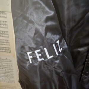 Represent your LA pride with this sleek black satin-y varsity jacket by 90s iconic sportswear brand Starter. This is an awesome new with tags varsity letterman jacket with FELIZ on the arm, it's spanish for Happy but also a player's last name :) Neftali Feliz