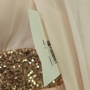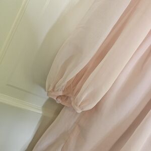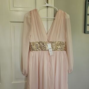 This elegant long sleeve dress features a soft pink hue with stunning gold accents. Perfect for any special occasion, it combines style and comfort effortlessly.
