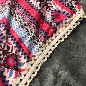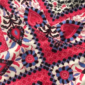 Vibrant one piece with intricate patterns. Features a mix of pink, blue, and cream. Stylish and unique design.