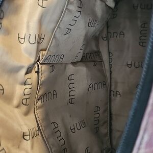 Anna by Anushka, Hand painted Shoulder/Crossbody Leather purse, preowned. This is a beautiful purse with very detailed painting and storage. The front has a double zippered all-around compartment that opens to 5 credit card/ID slots and two open style pockets. the signature Anna is written all over the liners. Beige lining. The front has two hand painted flowers and foliage. The back exterior has another large zippered pocket and is hand painted with flowers. The colors are muted together with greens yellows reds. The main compartment is zippered and opens to a zippered pocket and two open style pockets, all in the signature Anna material.