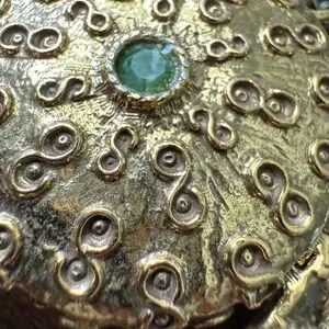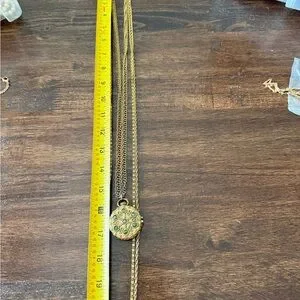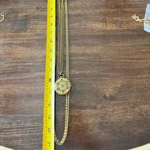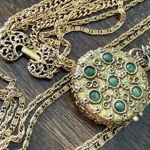 Beautiful unique gold at New York multi strand necklace with green jade like gems. Has locket pill box type pendant and different kind of chains. Beautiful piece. See photo for length the longest looks to be about 44 inches.