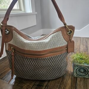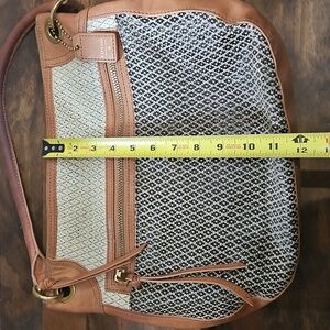 Stylish Fossil shoulder bag. Features black and tan pattern. Durable leather accents. Perfect for everyday use.