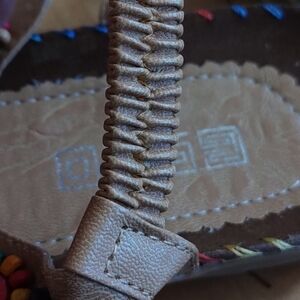 Step out in style with these boho tan sandals, featuring vibrant wooden beaded accents and rainbow whip stitching. Perfect for adding a pop of color to any outfit. Great pre-owned condition with light wear to the sole.