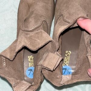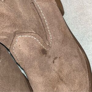 Light tan suede boot with normal wear as seen in pictures. See pics for stain spots.