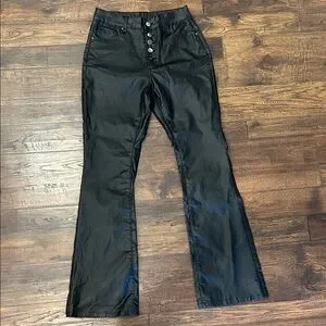 Stylish black flared faux leather pants with button-up front.