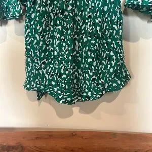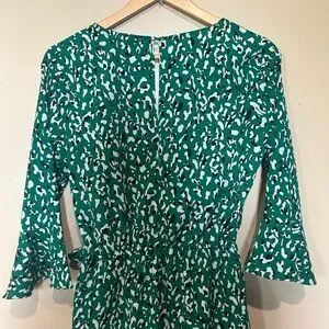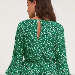 Stylish green romper with a playful pattern. Features a V-neck and ruffled sleeves. Perfect for casual outings.