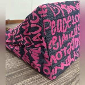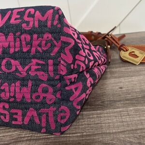 This rare Dooney & Bourke Peace Love Mickey shoulder bag is from the Disney Denim collection and is in excellent, NWOT condition. The bag is denim with pink velour writing and includes a beautiful Dooney hang tag. The hot pink interior features multiple pockets both zippered and open with plenty of space for the essentials. Approximate measurements are 12" length, 9.5" height, 6.5" depth