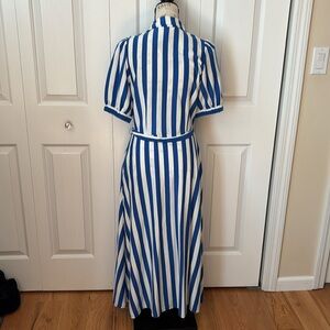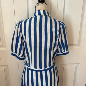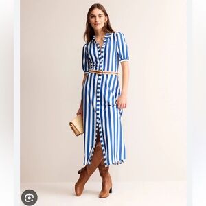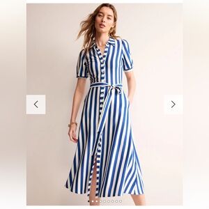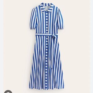 New with tags Boden UK Libby Jersey shirt dress in white and blue. Puff sleeves, tie belt and side pockets. Size USA 8 - bust measures 18 1/2 inches across, waist 15 1/2 inches and 48 inches long.