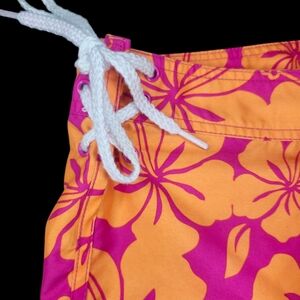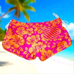 Women's bright orange and pink Hawaiian flower-themed board shorts. Side tie-ups. One back pocket. Lightweight and perfect for the beach.