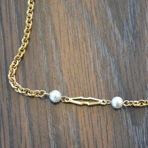 Eye catching bright gold tone necklace with faux pearls and decorative links.