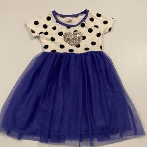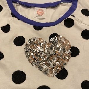 Sequined heart, off white polka dot dress, purple/blue tool bottom. Size small