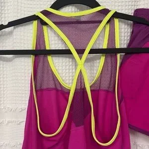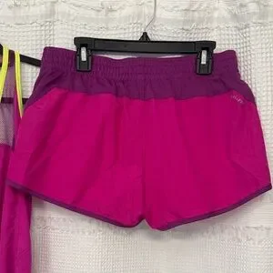 Vibrant pink shorts with yellow accents. Comfortable and stylish for workouts. Top included