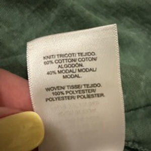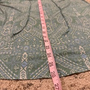 This is a pre-owned Lucky Brand top, size Large. The top features a green and blue geometric pattern. It has a V-neck with tie strings and ruffled cap sleeves. The material is a blend of cotton, modal, and polyester. The top measures approximately 19 inches across the chest and 27 inches in length. There are no visible stains or tears.