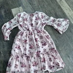 Charming pink dress with floral design. Features bell sleeves and ruffled hem. Perfect for casual outings.