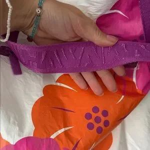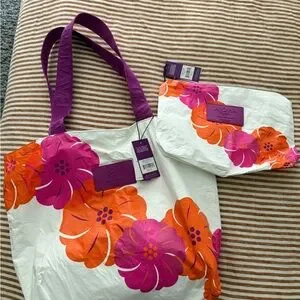 ALOHA Collection tote and pouch with vibrant pink and orange floral design. Ideal for beach trips.