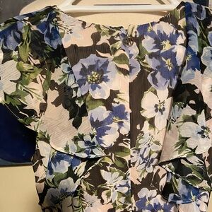 Silky type fabric that flows as you go. Really cute multi-color print. Very feminine with ruffles in sleeve, side & hem.