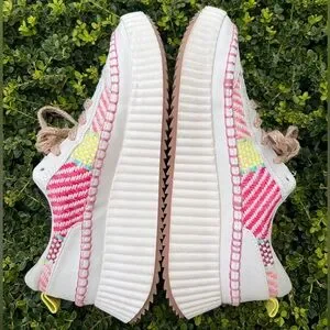 The Dolce Vita Daran Woven Women's Platform Wedge Sneakers in size 9M are a stylish and comfortable choice for active women. These low-top lace-up sneakers feature a colorful woven fabric upper with a rubber outsole for added durability. The scalloped platform wedge design provides extra height and comfort, making them ideal for walking, school, or casual wear. With a versatile design that can be worn in any season, these sneakers are a fashionable and practical addition to any wardrobe.