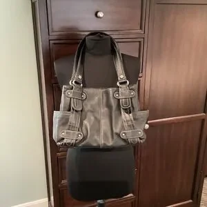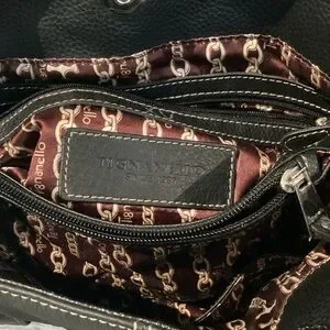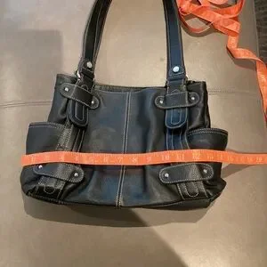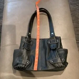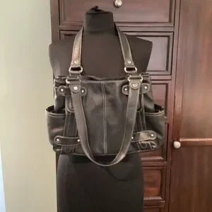 Tignanello black leather shoulder bag with side pockets, magnetic snap closure, and multiple interior zippered compartments. Some strap damage, as shown. Otherwise in excellent used condition. Interior is clean.