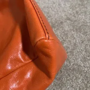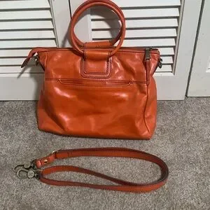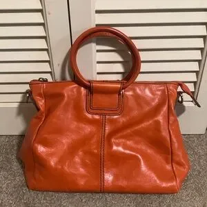 Beautiful Sheila medium HOBO bag in excellent condition. Bright orange, very clean inside. Small tads of wear on the outside bottom corners. Gold hardware and cones with crossbody strap (never used on bag). Bag has been carried very little. Leather is so soft! Measures 12” x 9” x 4”. Perfect for all occasions-dress up or casual.