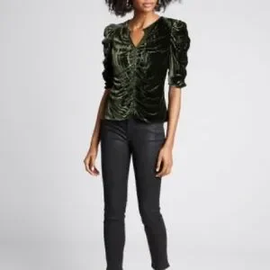 Elegant velvet blouse with ruched detailing. Features a deep V-neck and puffed sleeves. Perfect for a chic look.