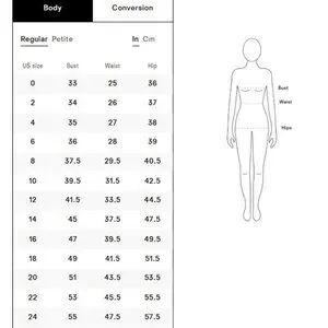 The model is wearing a US size 0 and is 177.8cm, 63.5cm waist, 87.6cm hips, 78.7cm bust.