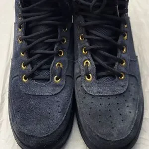 Stylish blue suede Nike utility sneakers with gold details. Mid-top design for comfort. Ideal for casual outings.