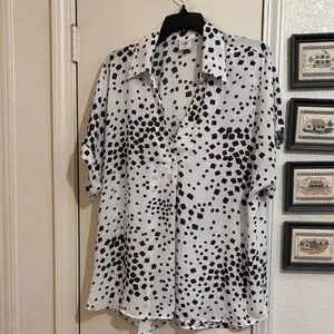 CAbi’s popular Replay top in geometric black and white design. Very versatile. Gently worn