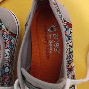 Lively Skechers sneakers with cartoon design. Features a mix of vibrant colors. Ideal for playful style.
