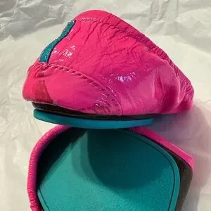 Brighten up your wardrobe with these vibrant pink shoes from Tieks. Perfect for any occasion, these shoes offer both style and comfort. A couple little flaws on the heels from driving. See photo.