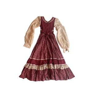 Keywords: vintage gunne sax Jessica McClintock prairie girl cottage core cottagecore shabby chic vtg 1970s 70s retro maxi dress red floral maroon lace puff sleeve long sleeve 3 size extra small xs
