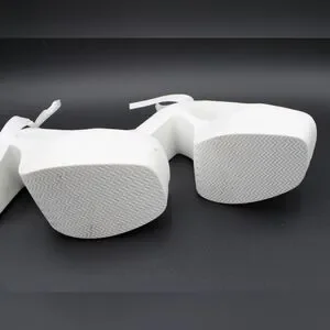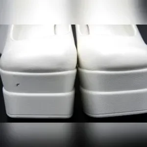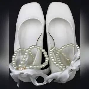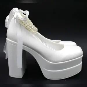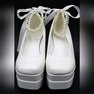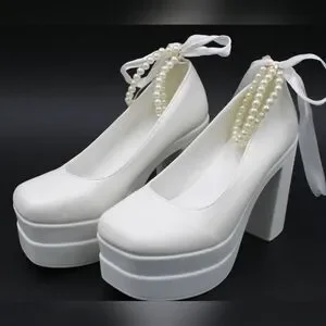 Gorgeous white 4-inch block heels with a pearl-decorated ankle strap and elegant back ribbon detailing. Platform sole for added comfort and style. One small black mark at the forefront as shown in photos – barely noticeable but noted for transparency.