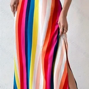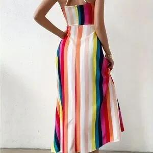 Gorgeous, colorful, striped dress. It has adjustable spaghetti straps and the top back of the dress is made with stretchy fabric. Material: 100% polyester. Wear this out on a summer night or in the day. You can dress this piece with jewelry and heels or dress it down with minimalist jewelry and flat sandals or wedge sandals. Machine washable. Picture 4: measurements
