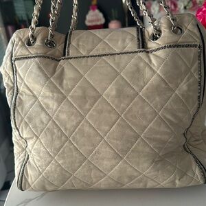 Chic Chanel leather shoulder bag with quilted design. Features a stylish chain strap and elegant flap closure. Some cracking and or fading ..vintage Chanel bag still in good condition !